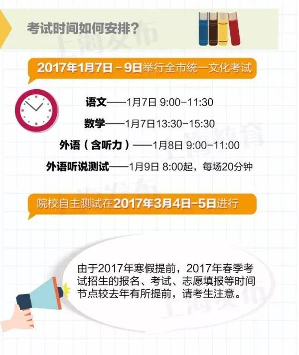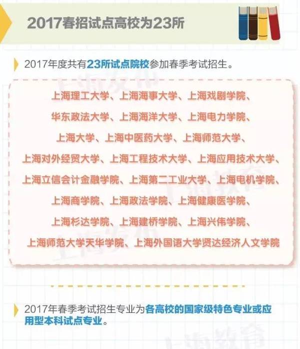 市教委昨天下午公布了《2017年上海市普通高校春季考試招生試點方案》。2017年上海市普通高校春季考試招生試點方案內容節選詳見以下圖解,了解更多詳情可點擊左下角“閱讀原文”查看。