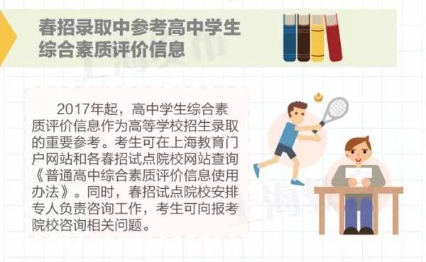 答:根據相關文件要求,2017年起,高中學生綜合素質評價信息作為高等學校招生錄取的重要參考。考生可在上海教育門戶網站和各春招試點院校網站查詢《普通高中綜合素質評價信息使用辦法》。同時,春招試點院校安排專人負責咨詢工作,考生可向報考院校咨詢相關問題。