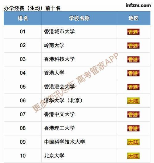 生均辦學(xué)經(jīng)費(fèi)方面,香港高校仍具有較明顯的優(yōu)勢,前十名中有7所為香港高校,且前五名全是香港高校,大陸地區(qū)僅有3所大學(xué)進(jìn)入前十名,澳門地區(qū)和臺(tái)灣地區(qū)生均經(jīng)費(fèi)最高的澳門大學(xué)和陽明大學(xué)分別位于第13名和第15名。