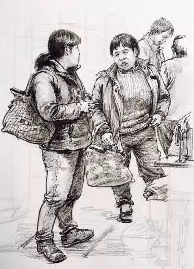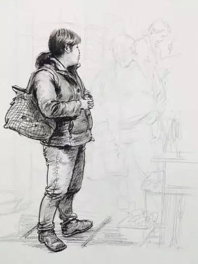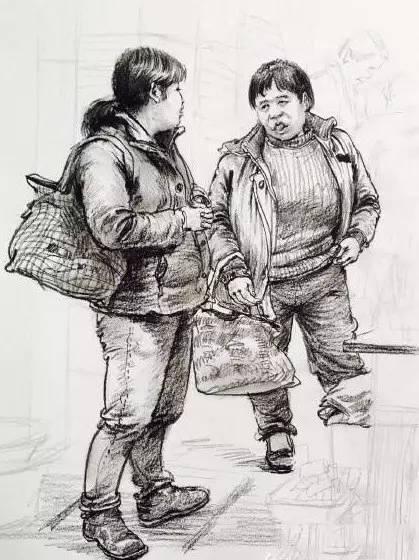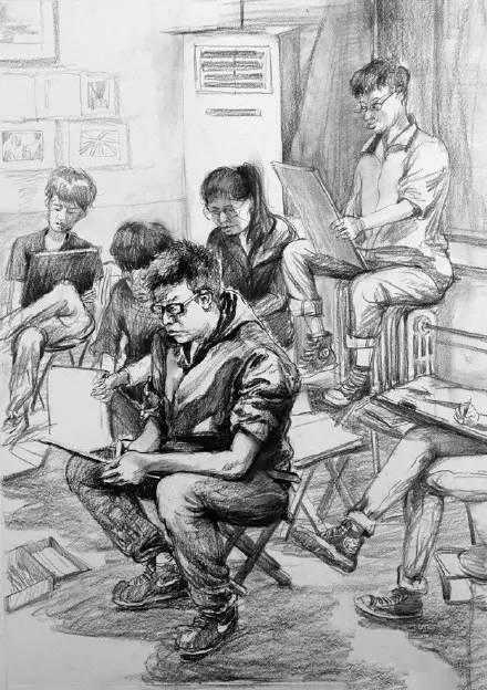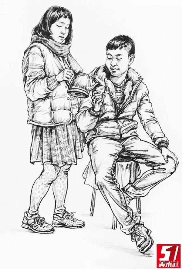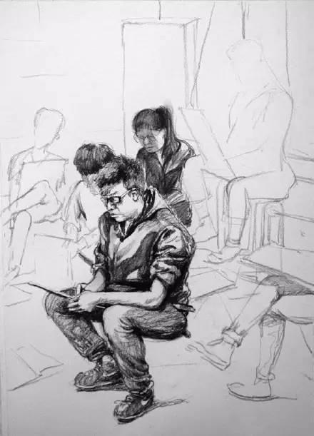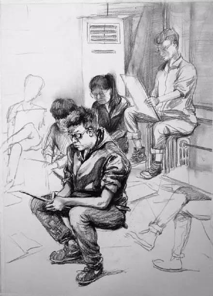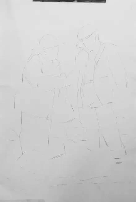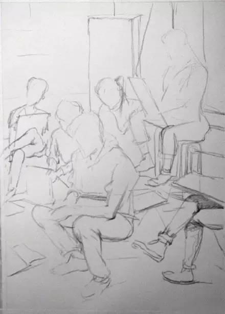 (3)進(jìn)一步深入,特別要注意幾個(gè)人之間的形體以及他們各自之間形體的穿插關(guān)系,人物的動(dòng)態(tài)特征也是表現(xiàn)的重點(diǎn)、難點(diǎn),要特別用心地對(duì)比再對(duì)比。女性的服裝可以表現(xiàn)得生動(dòng)些。